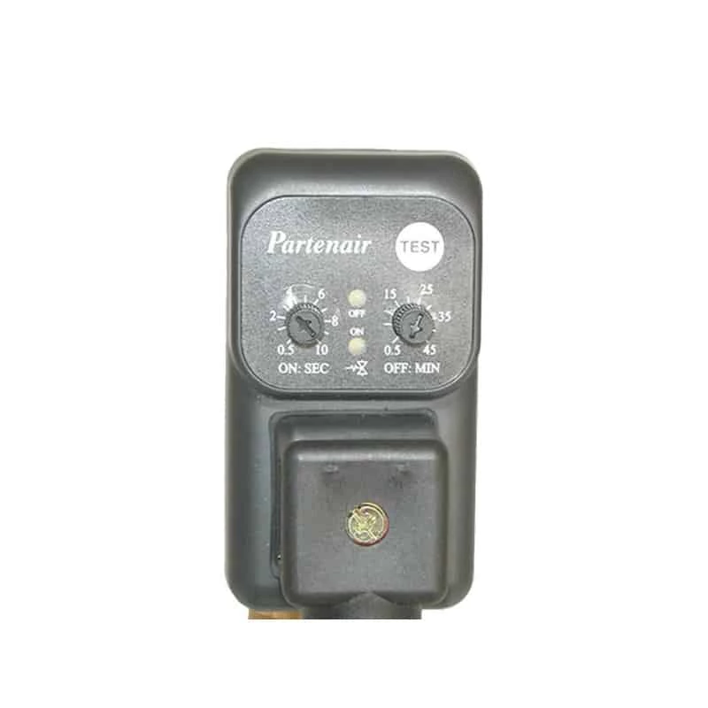 et le temps de purge (de 0,5 à 10 sec) en fonction de la taille du compresseur et l’intensité d’utilisation. Ses 2 leds indique sont statut de fonctionnement (en marche ou à l’arrêt) et enfin, le test de fonctionnement se fait manuellement grâce à son bouton dédié.