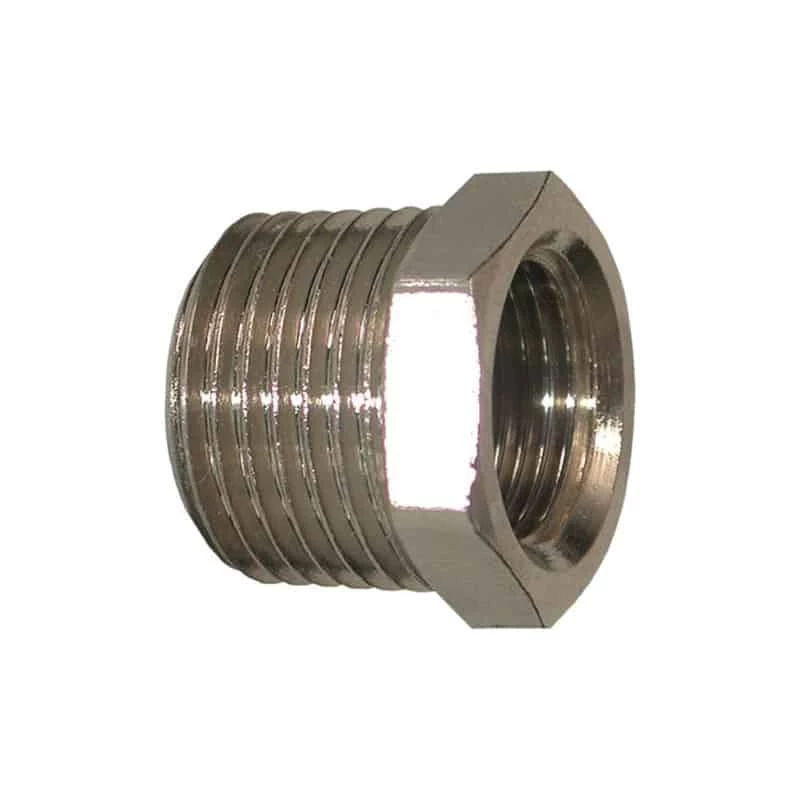 Raccord de jonction mâle/Femelle en laiton nickelé Lacmé 358 400 – Filetage et taraudage coniques : 1/2” Mâle – 3/8” Femelle – Hexagone 22 mm.