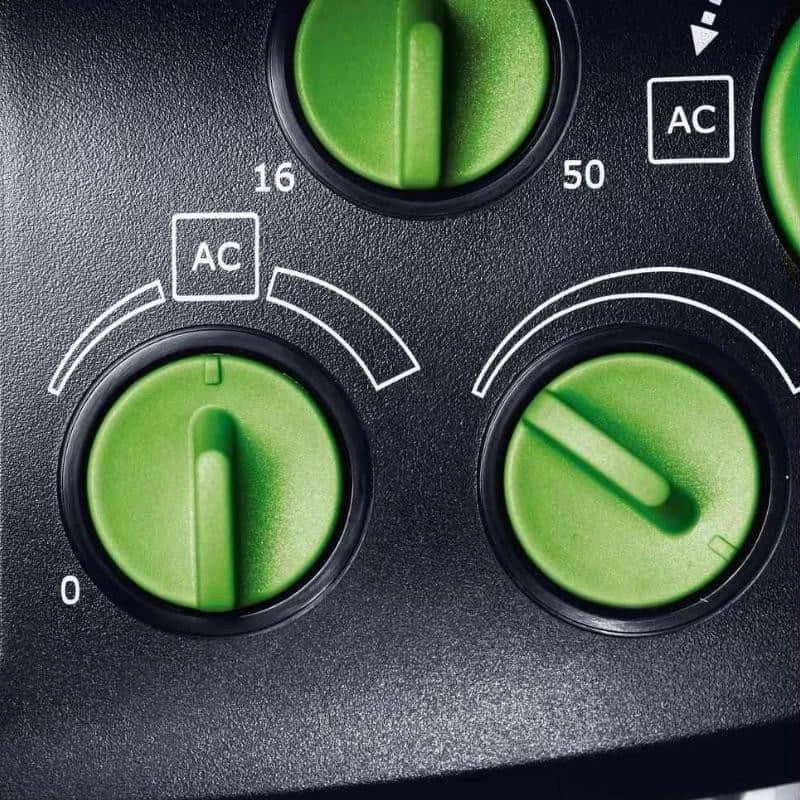 L’aspirateur CTL 36 E AC CLEANTEC de Festool possède une puissance d’aspiration élevée grâce au décolmatage automatique du filtre principal AUTOCLEAN et à la turbine compacte de hautes performances. Avec la molette, vous pouvez régler les intervalles de nettoyage. L’aspirateur s’active automatiquement lors de l’activation de votre outils.
