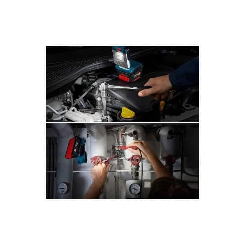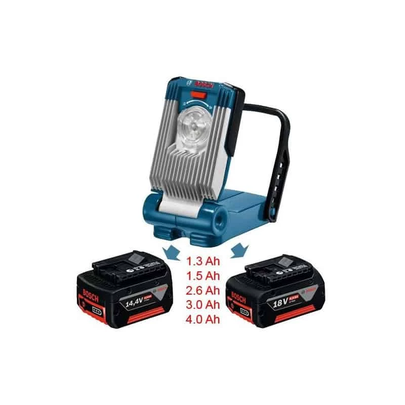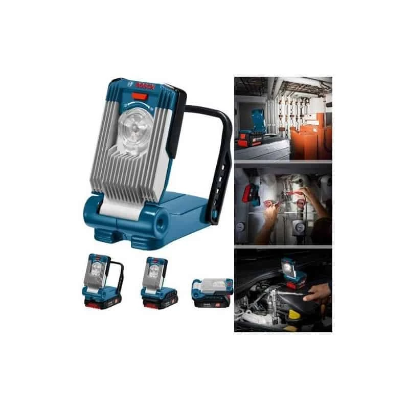 Utilisation avec toutes les batteries BOSCH Lithium-Ion 14,4 et 18 V. Robustesse extrême : continue de fonctionner normalement, même après une chute de 2 m sur du béton, grâce à son carter très résistant Dragonne pratique, en caoutchouc dur pour fixation de la lampe dans la position d’éclairement optimale de la zone de travail. Livrée sans batterie ni chargeur
