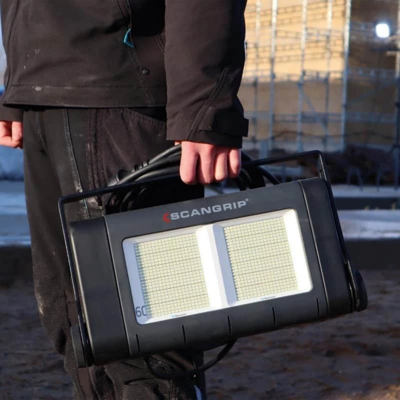 Le projecteur de chantier de ScanGrip est compact et offre des performances extrêmement élevées avec sa dernière technologie LED et ses 60 000 lumens. Éclairez intensément vos chantiers de construction ou vos entrepôts avec la SITE LIGHT 60 et son faisceau grand angle de 120°.